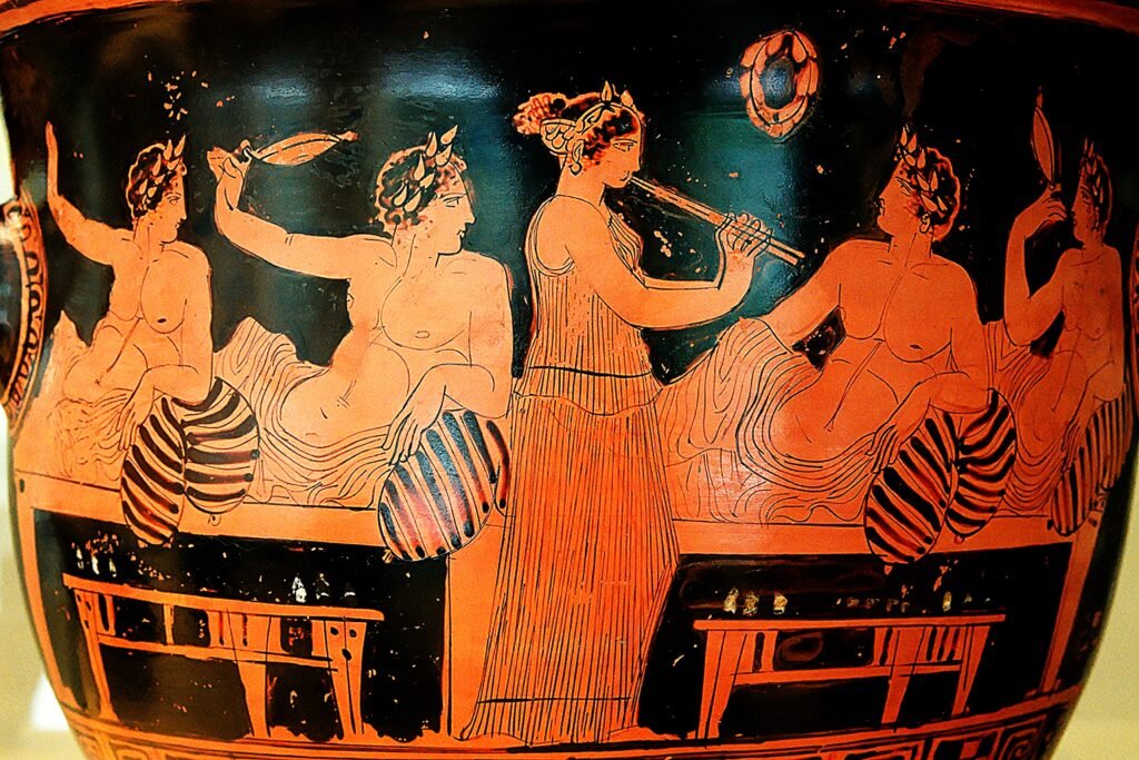 Yemekler andronda, erkeklerin bölümünde yenirdi. Şarap mutlaka vardı. Ekmek, zeytin, balık, peynir, baklagiller ve çeşitli soslarla hazırlanmış yemekler sunulurdu.